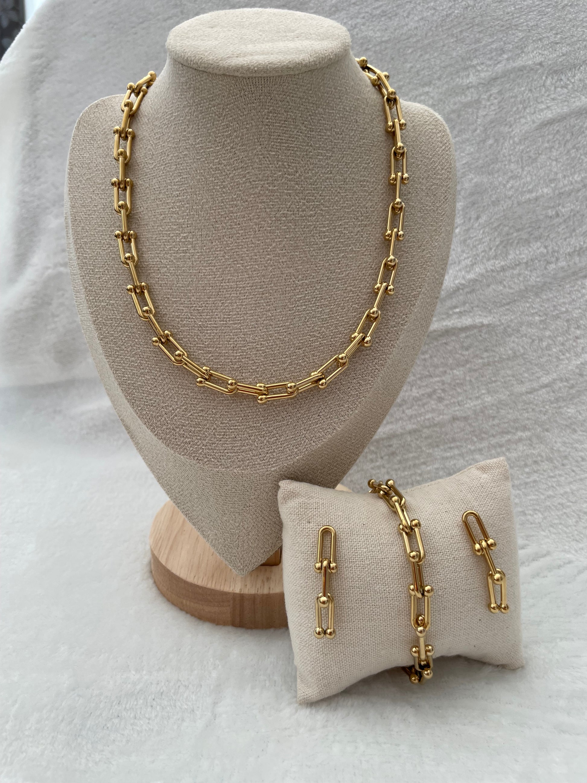 Conjunto de Collar, Pulsera y Aretes Dorados de Eslabones "U" con Detalles de Bolitas