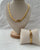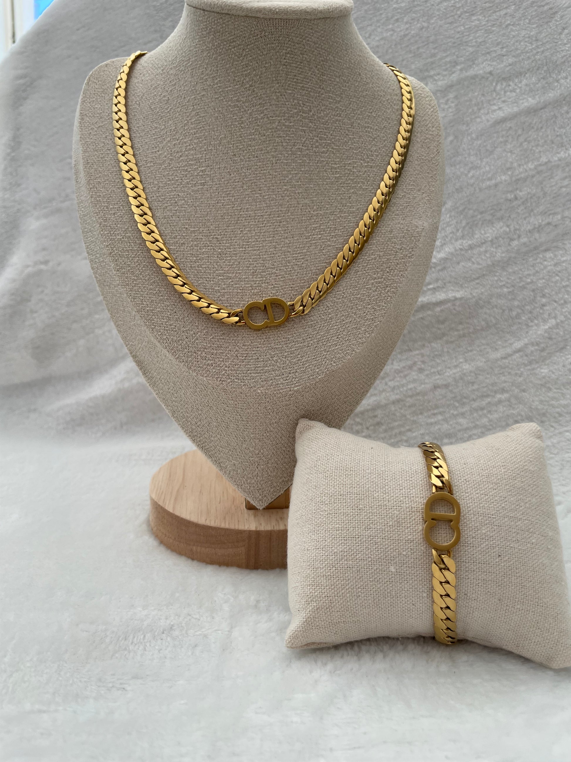 Este elegante conjunto de joyería incluye un collar y una pulsera, ambos confeccionados con eslabones planos de estilo cubano en un acabado dorado brillante. El collar se presenta en un busto de exhibición, mostrando su longitud perfecta para un escote. Tanto el collar como la pulsera incorporan un distintivo detalle central con las iniciales "CD" entrelazadas, añadiendo un toque de diseño y sofisticación. La pulsera descansa sobre un pequeño cojín de tela natural, complementando la estética pulcra y refinada del set. Es un accesato ideal para quienes buscan un estilo moderno y atrevido.