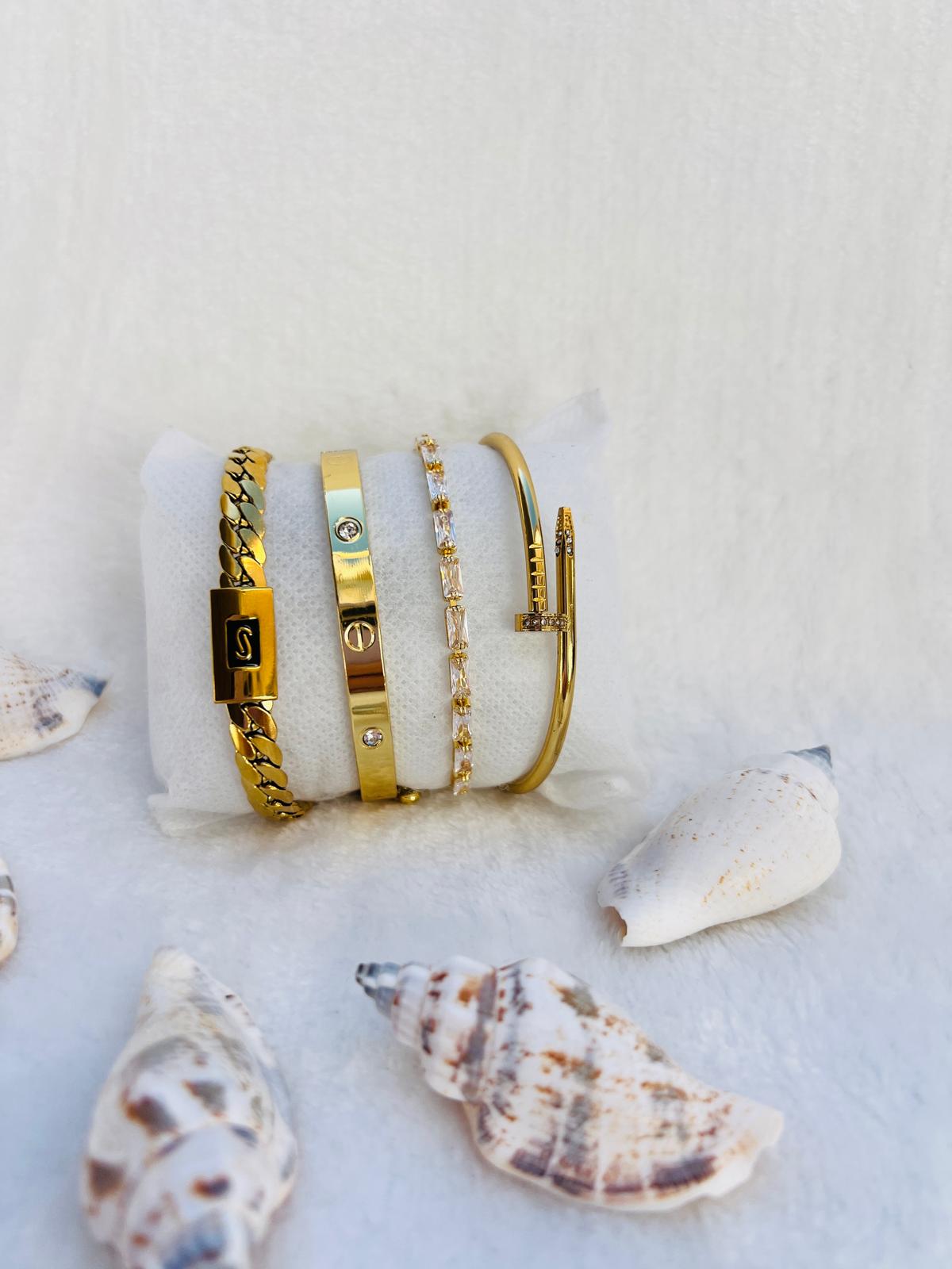 Esta imagen captura una colección de hermosas pulseras doradas, cada una irradiando un brillo exquisito y una elegancia atemporal. Presentadas delicadamente sobre un suave cojín blanco, los diseños únicos de las pulseras se complementan perfectamente con la presencia sutil de conchas marinas, añadiendo un toque de sofisticación natural. Una composición que evoca lujo, estilo y un gusto impecable.