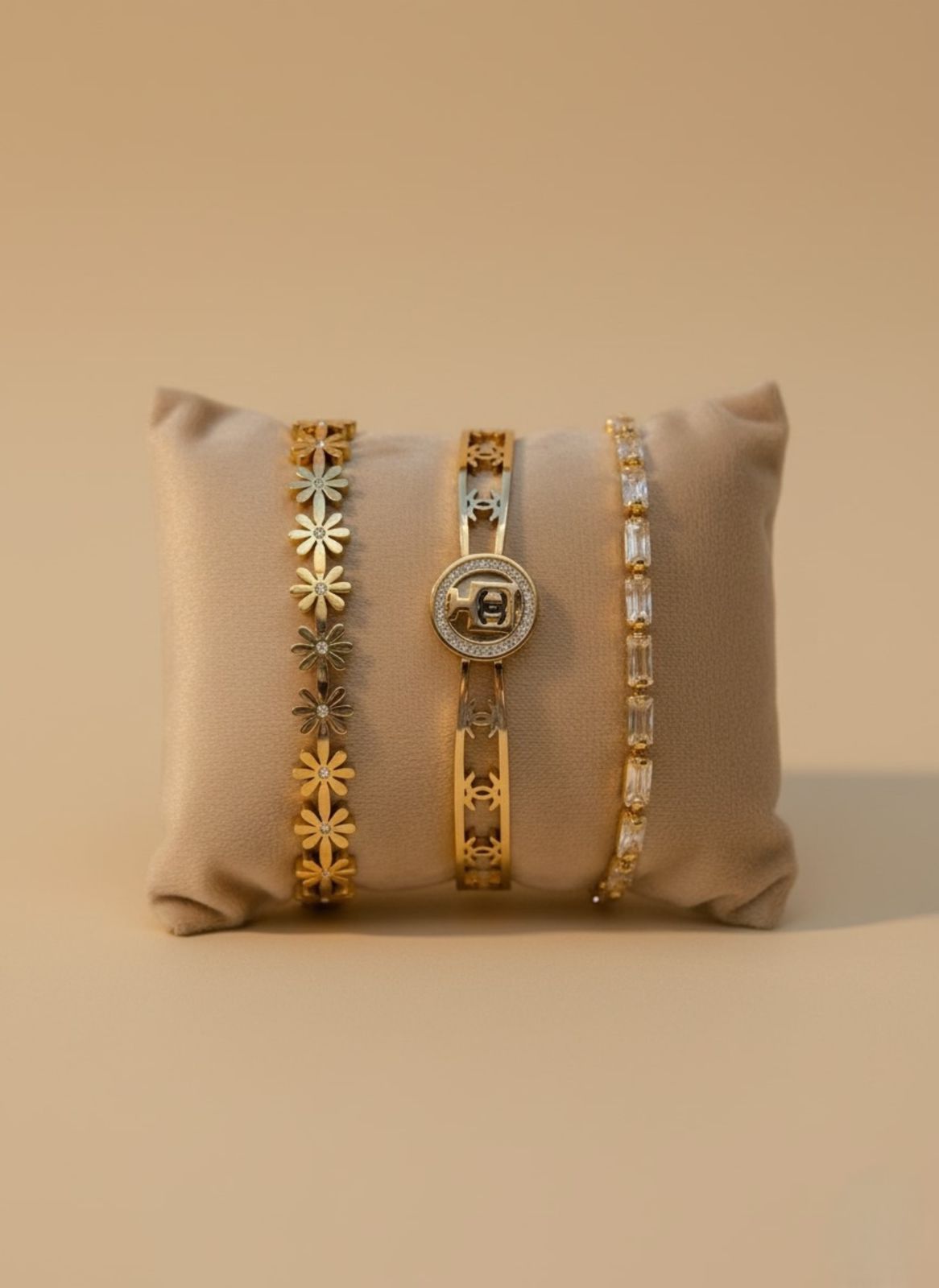 Esta imagen presenta un trío de pulseras doradas con diseños distintivos, elegantemente exhibidas sobre un cojín de terciopelo beige. A la izquierda, una pulsera de cadena fina está adornada con una serie de delicadas flores doradas, algunas de las cuales están acentuadas con pequeños brillantes en el centro, creando un encanto femenino y primaveral. En el centro, una pulsera rígida dorada presenta un diseño perforado de motivos icónicos, con un círculo central adornado con brillantes y las letras "CC" entrelazadas, exudando lujo y reconocimiento de marca. A la derecha, una pulsera estilo tenis de brillantes rectangulares, engastados en oro, ofrece un brillo sofisticado y lineal, aportando un toque de elegancia atemporal. Juntas, estas pulseras ofrecen una variedad de estilos que van desde lo delicado y floral hasta lo audaz y lujoso, perfectas para complementar cualquier atuendo con un toque de distinción.
